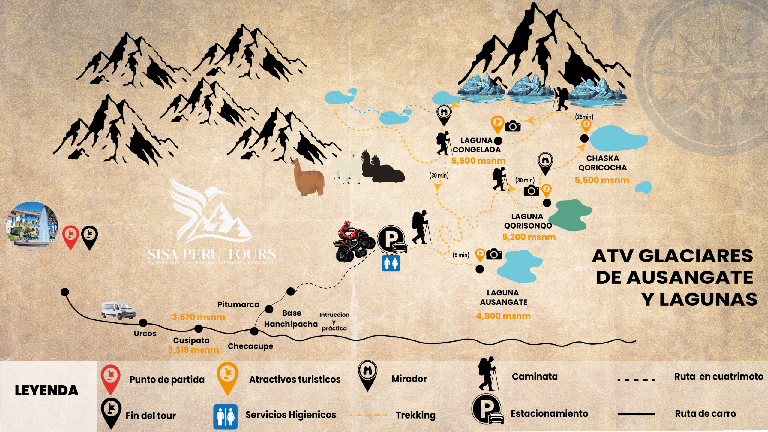 Vivir el tour Ausangate en cuatrimotos con Sisa Peru Tours es una experiencia que combina adrenalina, turismo de aventura y paisajes altoandinos. A bordo de cuatrimotos (ATV) recorrerás valles de altura, montañas nevadas, glaciares y lagunas turquesa alrededor del Ausangate, una de las montañas sagradas más imponentes de Cusco.